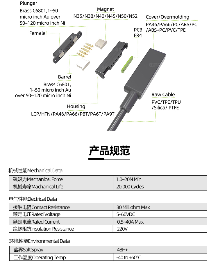 Ο μαγνητικός σύνδεσμος είναι ένας συνδυασμός μαγνητών με βάση τον συνδετήρα πείρου pogo και η χρήση μόνιμων μαγνητών RuFeB διασφαλίζει μια σταθερή και αξιόπιστη σύνδεση μεταξύ του αρσενικού και του θηλυκού. Ο μαγνητικός σύνδεσμος pogopin αντισταθμίζει τα πλεονεκτήματα της βολικής εισαγωγής, της ασφάλειας, του συμπαγούς μεγέθους, του εύκολου καθαρισμού και της πλευρικής εξαγωγής που δεν διαθέτουν οι παραδοσιακοί σύνδεσμοι και πραγματοποιεί πραγματικά 100 τοις εκατό αυτόματη τοποθέτηση, αυτόματη σύνδεση, γρήγορη εισαγωγή, διαχωρισμό από εξωτερική δύναμη, Αναγκαστική η αποσύνδεση δεν θα βλάψει τη θύρα σύνδεσης και άλλες λειτουργίες της συσκευής. Έχει διαδοθεί γρήγορα και χρησιμοποιήθηκε σε πολλούς τομείς.